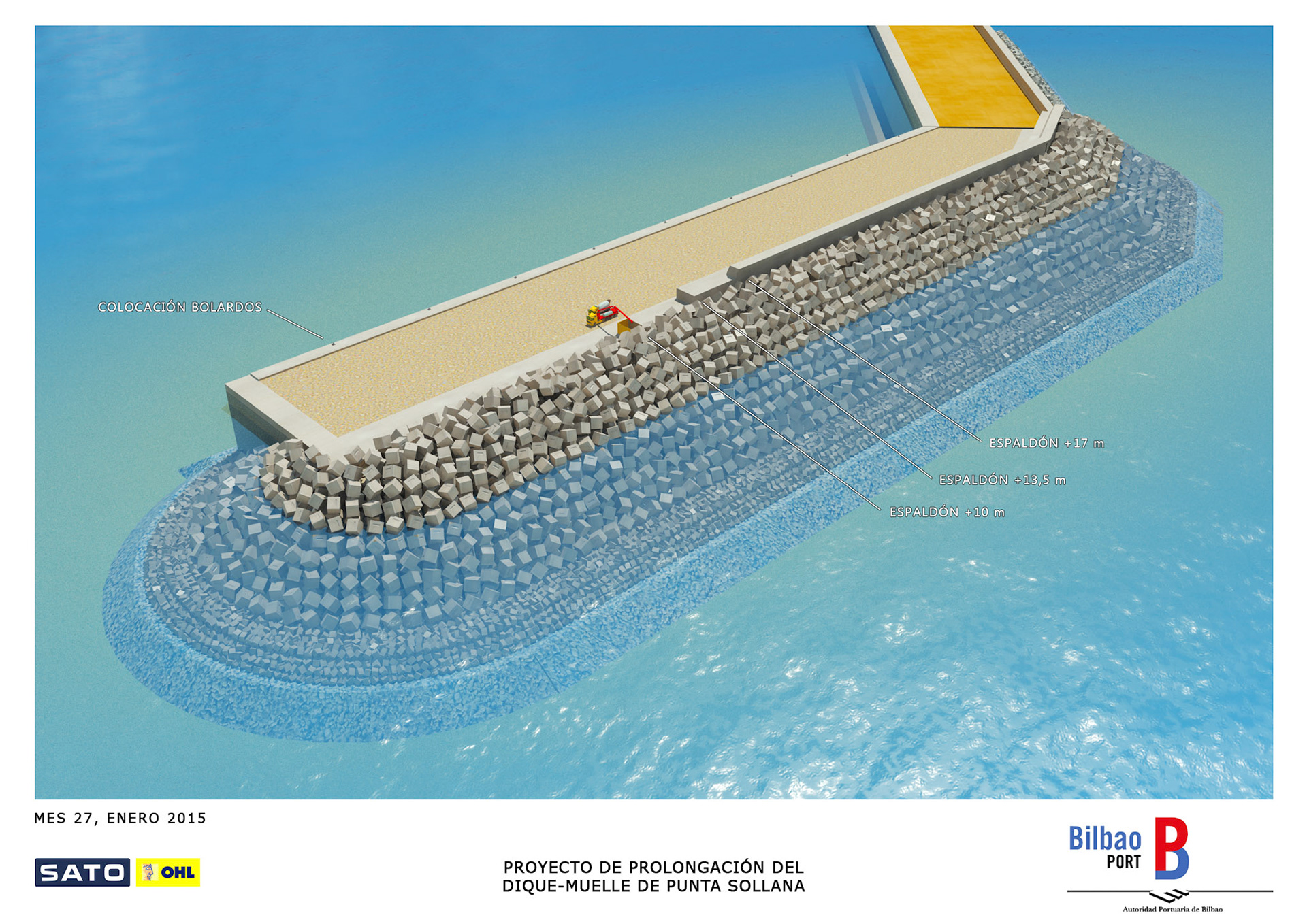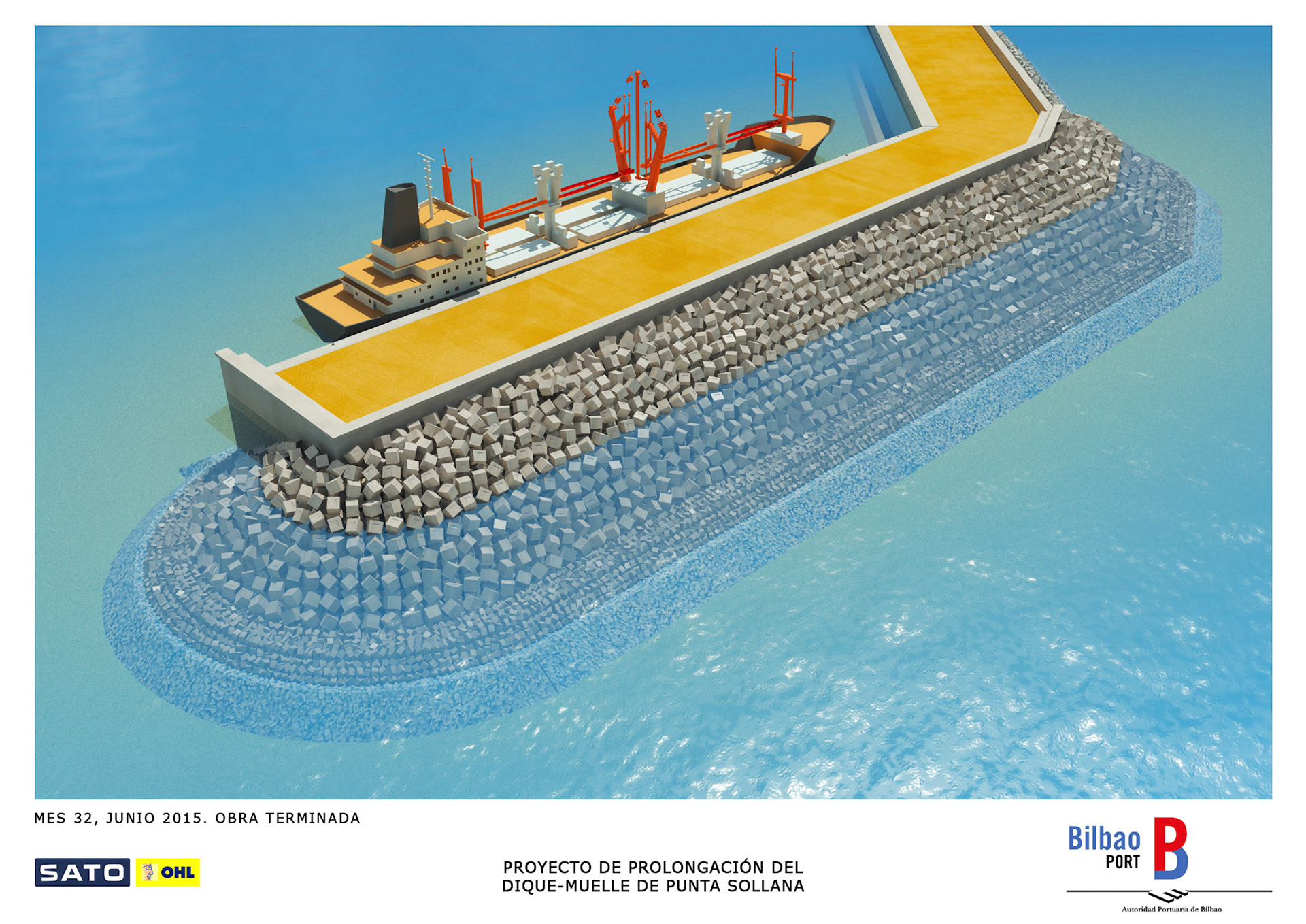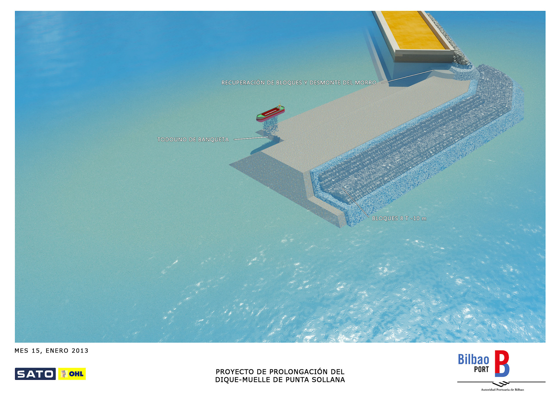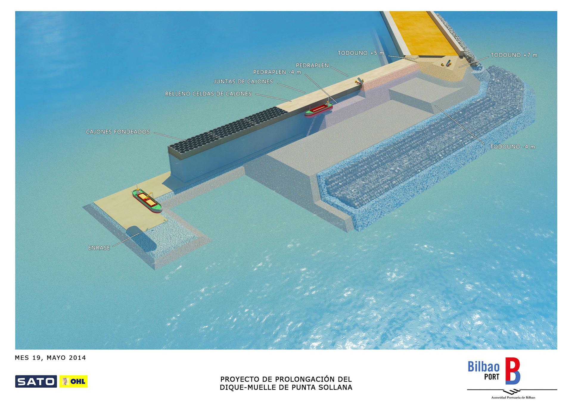 Infografie realizzate per mostrare il processo costruttivo del prolungamento del molo Punta Sollana del porto di Bilbao per il consorzio formato da OHL e Sato.