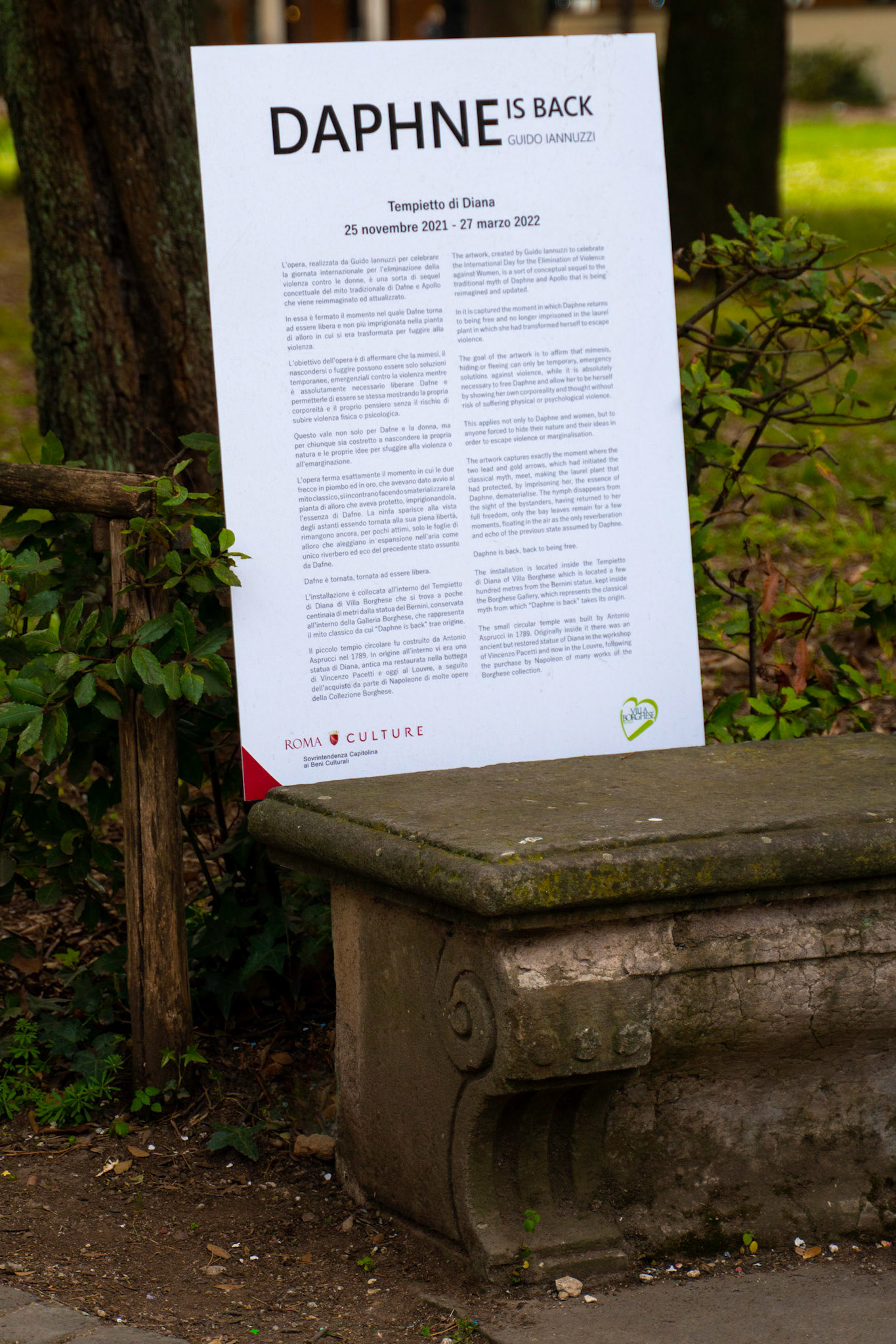 L'opera è stata allestita nel Tempietto di Diana a Villa Borghese tra il 25 novembre 2021 ed il 27 marzo 2022.